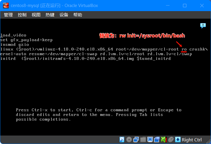 CentOS·8重置root密码2025年2月26日 · 阅读需 1 分钟操作过程 操作过程 实际操作下来 5分钟左右 进入Linux编辑模式。 通过一系列命令重置密码。 自动重启。 操作 选中第一行,按 e 键,进入编辑模式。 找到linux开头的行,将该行中ro替换为rw init=/sysroot/bin/bash rw后有空格,\是系统自动加的 替换完成见下图 编辑完点CTRL+X,保存并启动。启动后如下图: 分别输入命令: /# chroot /sysroot//# LANG=en (把语言改为英文)/# passwd (设置密码)/# touch /.autorelabel 输入完成后,按CTRL+D,输入reboot,等待重启即可。 可能会重启2遍